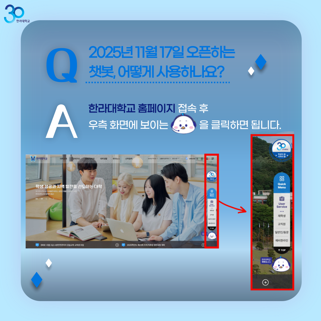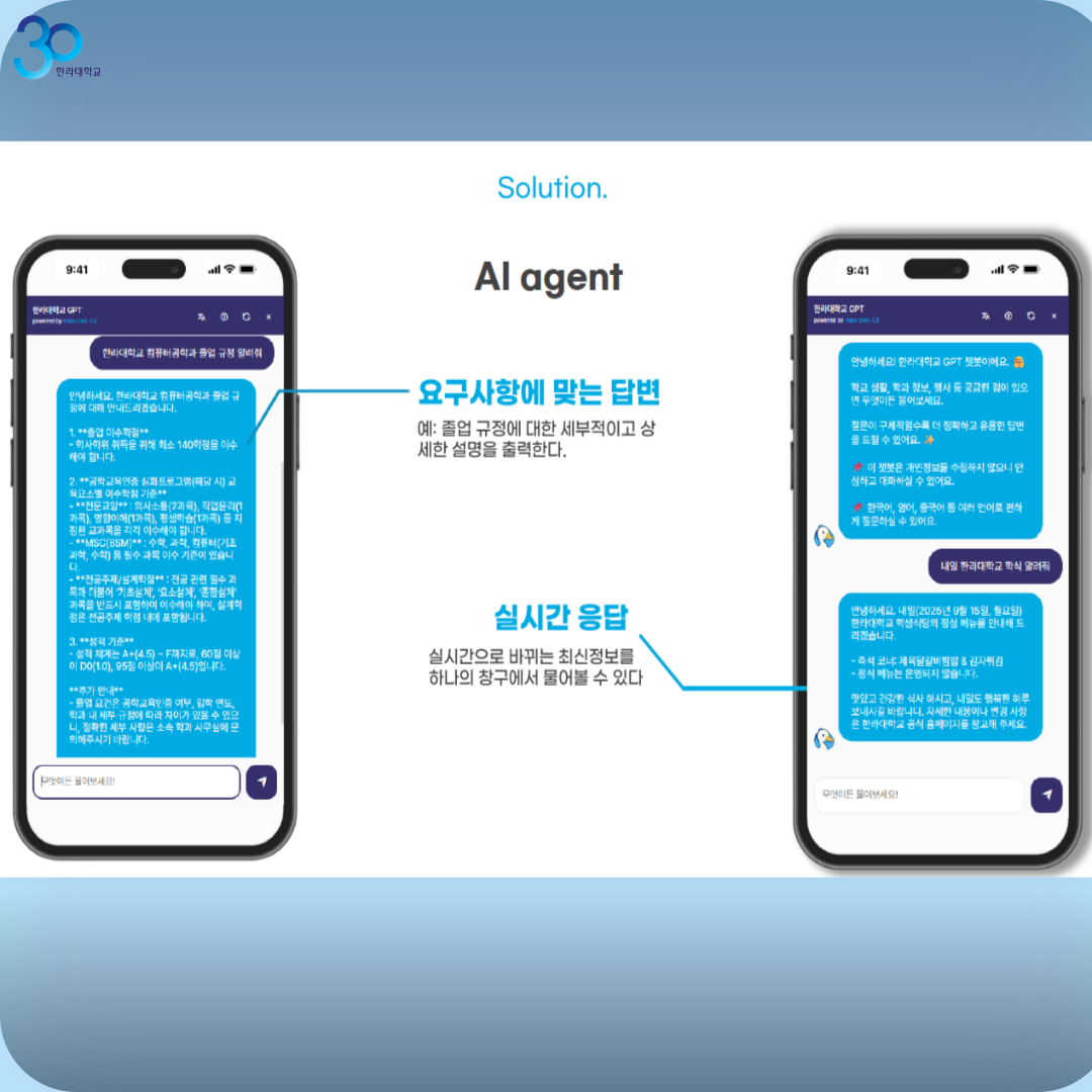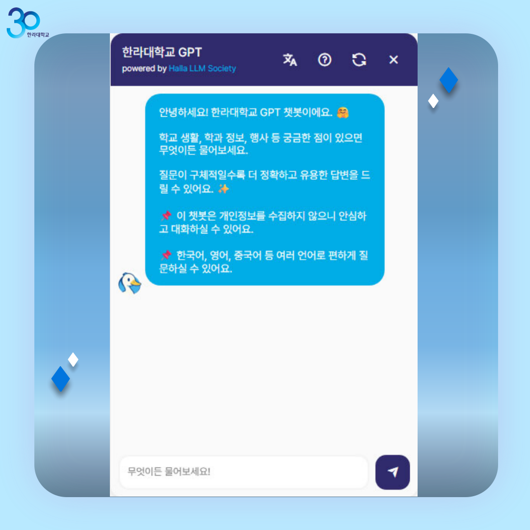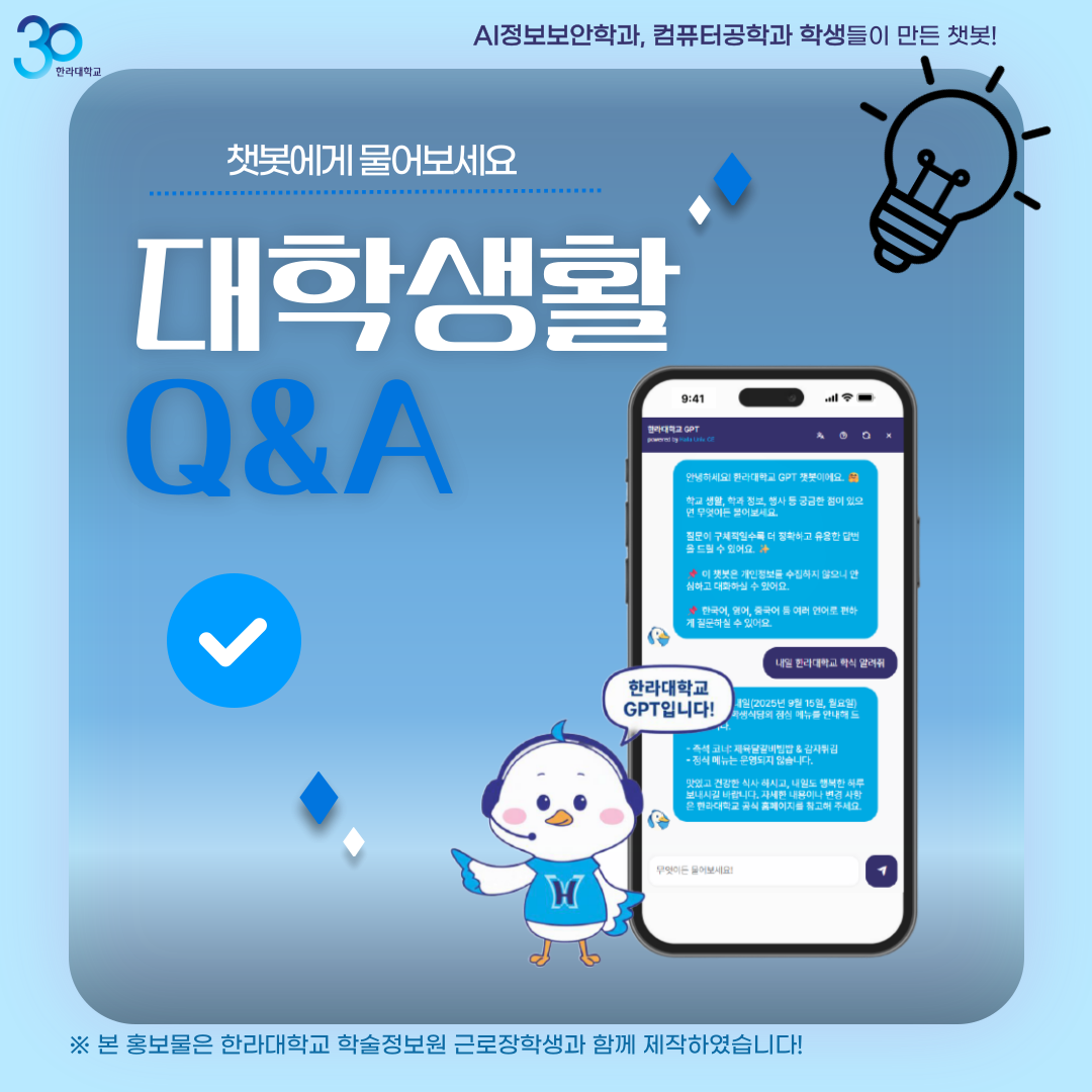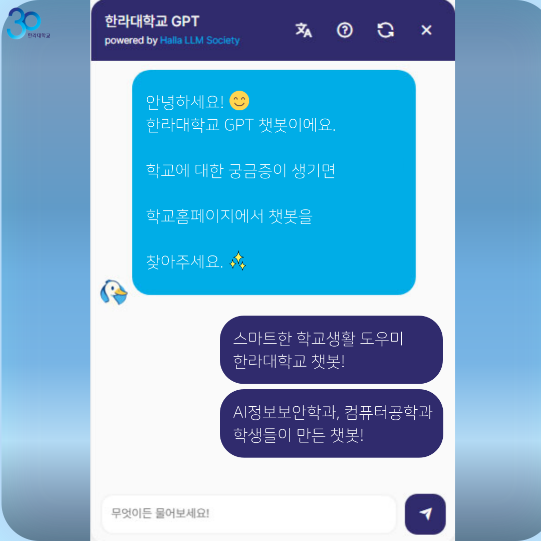 AI정보보안학과와 컴퓨터공학과 학생들이 모여서 만든 “한라대학교 챗봇”을 오픈합니다.