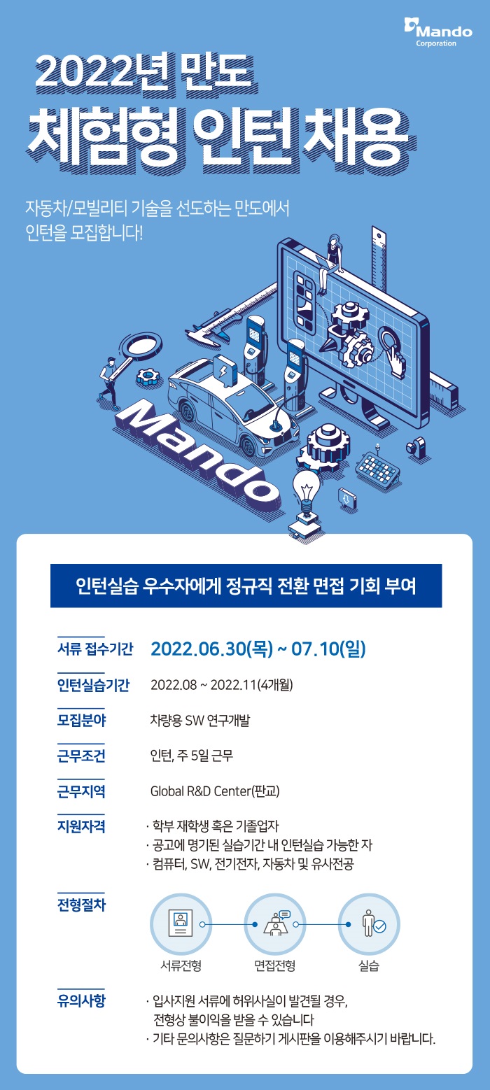 2022년 만도 체험형 인턴 채용 자동차/모빌리티 기술을 선도하는 만도에서 인턴을 모집합니다! 인턴실습 우수자에게는 정규직 전환 면접 기회가 부여됩니다 인턴 실습부터 정규직 전환 기회까지! 2022 만도 체험형 인턴 채용 - 자세히 보기 (하단 링크 클릭) 01. 서류 접수기간 2022.06.30 (목) ~ 07.10(일) 02. 인턴 실습기간 2022.08 ~ 2022.11 (4개월) 03. 모집 분야 차량용 SW연구개발 04. 근무 지역 판교 (Global R&D Center) 05. 지원 자격 - 학부 재학생 혹은 기졸업자 - 공고에 명기된 실습기간 내 인턴실습이 가능한 자 - 컴퓨터, SW, 전기전자, 자동차 및 유사전공 06. 전형 절차 서류전형 - 면접전형 - 실습 07. 접수 방법 서류 접수 페이지 (http://mando.saramin.co.kr/?dir_no=32339) 에서 '지원하기' 버튼 클릭 *기타 문의사항은 질문하기 게시판을 이용해주시기 바랍니다. |